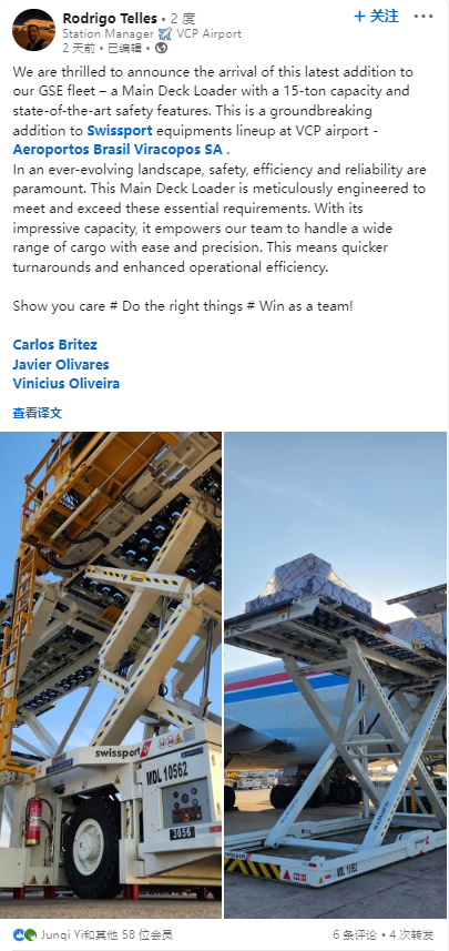 近期,由于威海廣泰集裝貨物裝載機(jī)在海外市場(chǎng)的出色作業(yè)表現(xiàn),全球領(lǐng)先的地服公司Swissport的一位相關(guān)代表在領(lǐng)英發(fā)文為廣泰產(chǎn)品點(diǎn)贊!我們很高興地宣布我們GSE車隊(duì)的最新成員的到來——一臺(tái)承載重量為15噸、具有最先進(jìn)安全功能的集裝貨物裝載機(jī)。這是Swissport在坎皮納斯國(guó)際機(jī)場(chǎng)的…