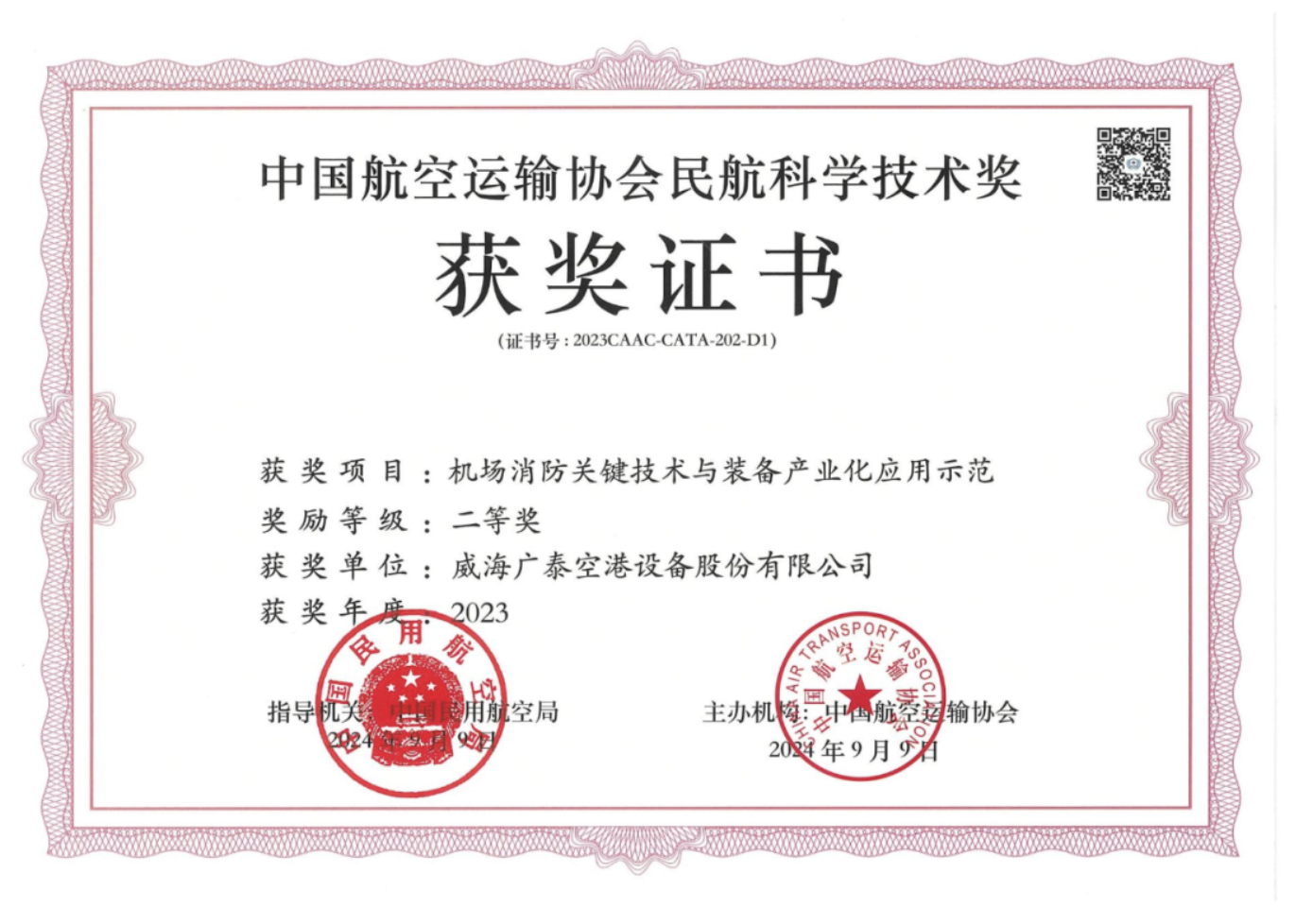 2024年10月25日,民航局第二屆CATA大會在北京召開,會議期間舉行了2022年度和2023年度中國航空運輸協(xié)會民航科學(xué)技術(shù)獎頒獎。威海廣泰“機(jī)場消防關(guān)鍵技術(shù)與裝備產(chǎn)業(yè)化應(yīng)用示范”和“智能萬向傳輸航空貨運裝載設(shè)備關(guān)鍵技術(shù)開發(fā)與應(yīng)用”項目分別榮獲“2023年度中國航空運輸協(xié)會民航科學(xué)…