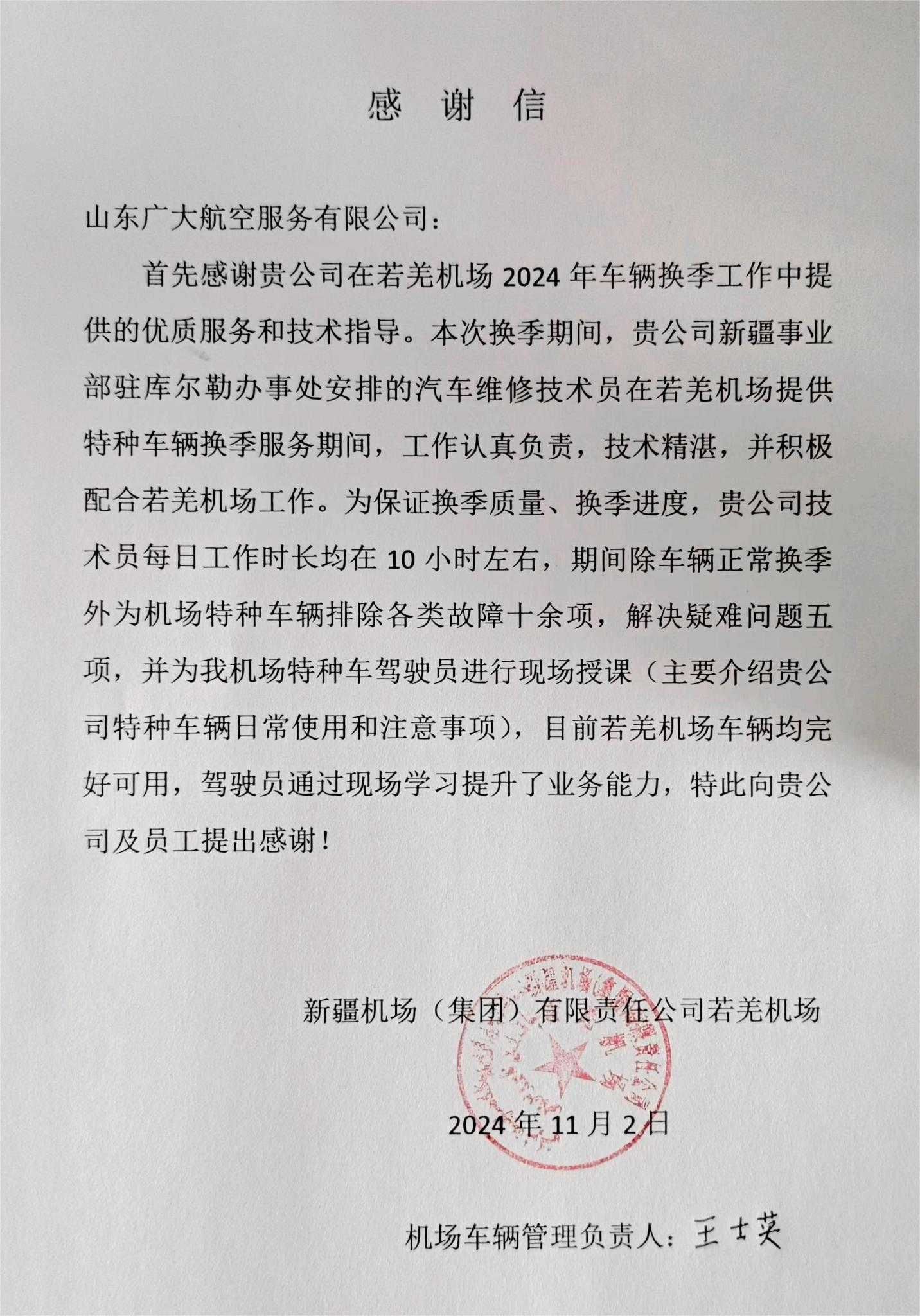 近日,新疆機(jī)場(集團(tuán))有限責(zé)任公司若羌機(jī)場向山東廣大航空服務(wù)有限公司(以下簡稱“廣大航服”)致感謝信,對其在2024年車輛換季工作中提供的優(yōu)質(zhì)服務(wù)和技術(shù)指導(dǎo)表示誠摯的感謝。若羌機(jī)場在感謝信中提到,廣大航服的汽車維修技術(shù)員在換季期間表現(xiàn)出色,以專業(yè)技能和敬業(yè)精神為若羌…