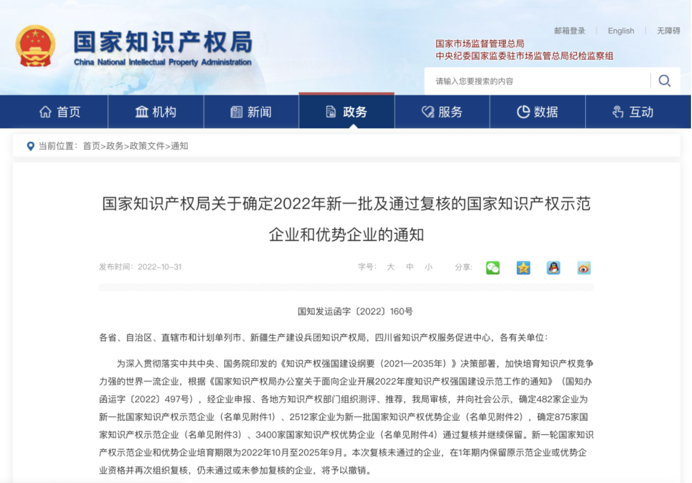 近日,國家知識(shí)產(chǎn)權(quán)局關(guān)于確定2022年新一批及通過復(fù)核的國家知識(shí)產(chǎn)權(quán)示范企業(yè)和優(yōu)勢企業(yè)的通知,威海廣泰空港設(shè)備股份有限公司(以下簡稱“威海廣泰”)喜獲“國家知識(shí)產(chǎn)權(quán)優(yōu)勢企業(yè)”稱號(hào)。為貫徹落實(shí)《知識(shí)產(chǎn)區(qū)強(qiáng)國建設(shè)綱要(2021-2035年)》和《“十四五”國家知識(shí)產(chǎn)權(quán)保護(hù)和運(yùn)用…