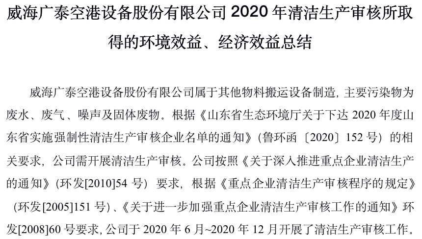 威海廣泰空港設備股份有限公司2020年清潔生產(chǎn)審核所取得的環(huán)境效益、經(jīng)濟效益總結威海廣泰空港設備股份有限公司屬于其他物料搬運設備制造,主要污染物為廢水、廢氣、噪聲及固體廢物。根據(jù)《山東省生態(tài)環(huán)境廳關于下達2020年度山東省實施強制性清潔生產(chǎn)審核企業(yè)名單的通知》(魯環(huán)函〔…