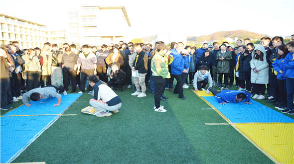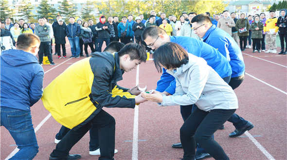 10月底的天氣雖有些寒意料峭,但比賽現(xiàn)場激情飛揚(yáng),各參賽隊(duì)之間你追我趕,競爭激烈。八個項(xiàng)目依次進(jìn)行,比賽高潮迭起,歡笑聲和加油聲交織在一起,令人歡欣鼓舞。八個項(xiàng)目中最精彩的要數(shù)運(yùn)動會壓軸戲“指壓板接力”?!熬W(wǎng)紅”指壓板可謂大名鼎鼎,但許多參賽隊(duì)員只在各種綜藝節(jié)目中見過,賽前有人對它不屑一顧,但當(dāng)真正脫下鞋子與它親密接觸后,才感受到它的“威力”。比賽每隊(duì)四人一組,第一名運(yùn)動員在指壓板上跳繩,跳滿20個接力給第二個運(yùn)動員,第二名運(yùn)動員在指壓板上作俯臥撐,做滿20個接力給第三人,第三名運(yùn)動員在指壓板上手腳并用爬行10米,傳遞給最后一名運(yùn)動員,最后一個人額頭上放一枚餅干,在指壓板上沖刺同時保證餅干不掉,第一個沖過終點(diǎn)的隊(duì)伍獲勝。伴隨著腳下的一陣陣“電流”,參賽運(yùn)動員們爭先恐后“痛并努力著”,拉拉隊(duì)的歡呼吶喊聲也將本次趣味運(yùn)動會推向一個小高潮。